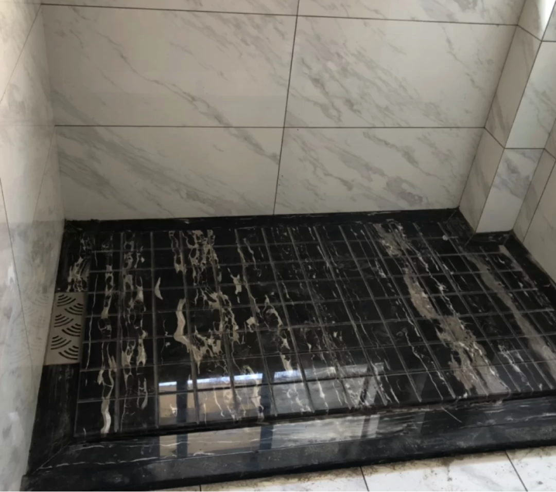 再铺贴拉槽大理石之前,先要做好二次排水的防护工作,避免造成排水堵塞问题,这里要注意一下,如果要做大理石拉槽,为了避免后期水从走水槽里渗透到大理石下面的砂浆层,一定要事先做好二次排水